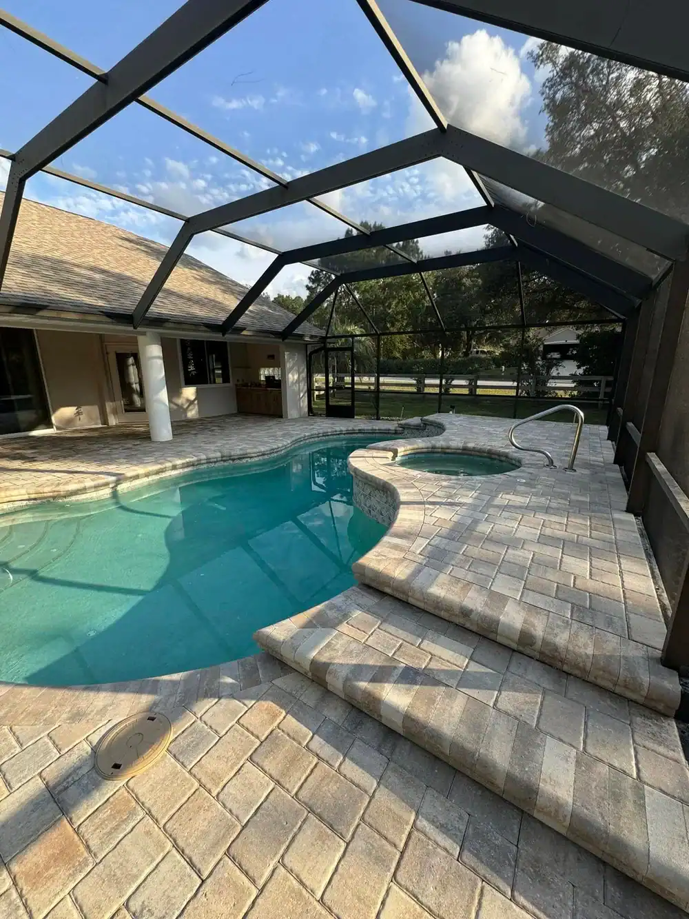 Concrete cracks. It’s not if, it’s when. And when it does, you’re looking at jackhammering and starting over. Pavers flex with ground movement. Individual pieces can be lifted and reset if needed. Plus they don’t get scorching hot like concrete does in Florida sun. Your bare feet will thank you. We’ve seen too many concrete pool decks that looked great for two years, then became liability nightmares. Pavers installed correctly last decades, not years.